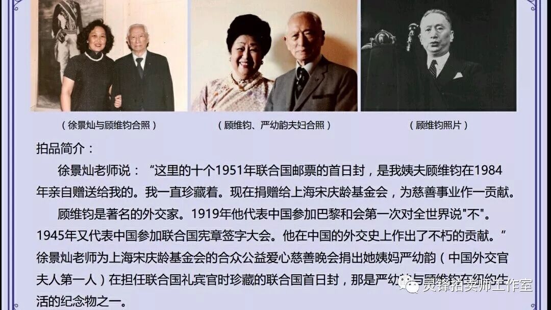 在拍品中是灵锋拍卖师不得不提到的一件就是前段时间微信疯传的严幼韵女士的一件藏品:联合国首日封。十个1951年联合国邮票的首日封由徐景灿老师捐出。